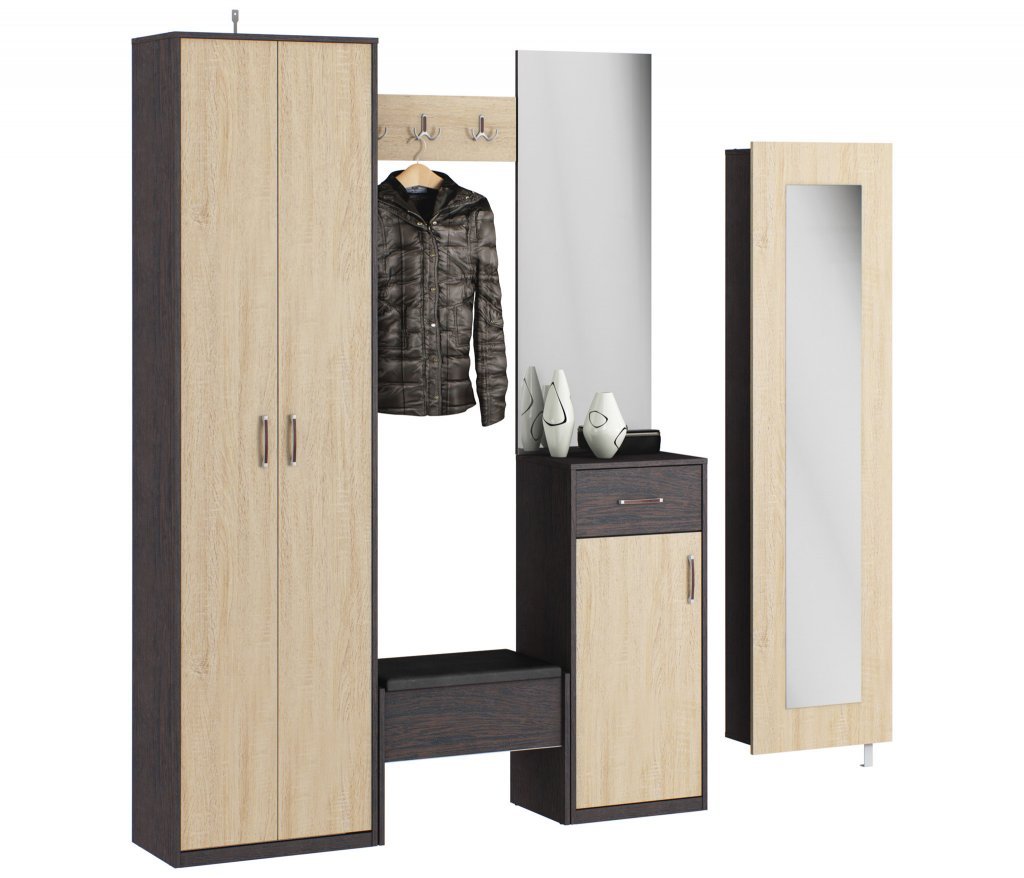 Что же включает набор мебели для прихожей? Как правило, это вертикальный высокий шкаф-пенал, открытые крючки для верхней одежды и тремплей на вертикальных ламелях, полки для аксессуаров. Дополнительно предусмотрены полки, калошницы, выдвигающиеся шкафы.