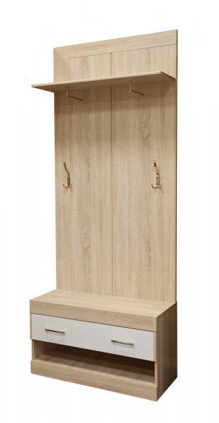 Функциональная стойка для прихожей имеет 2 штанги для вешалок, крючки для верхней одежды и аксессуаров, нишу для обуви, а также полочку для головных уборов.