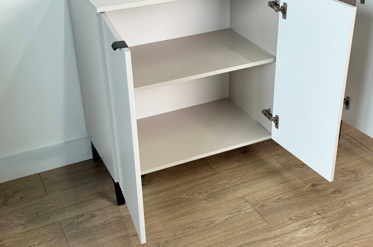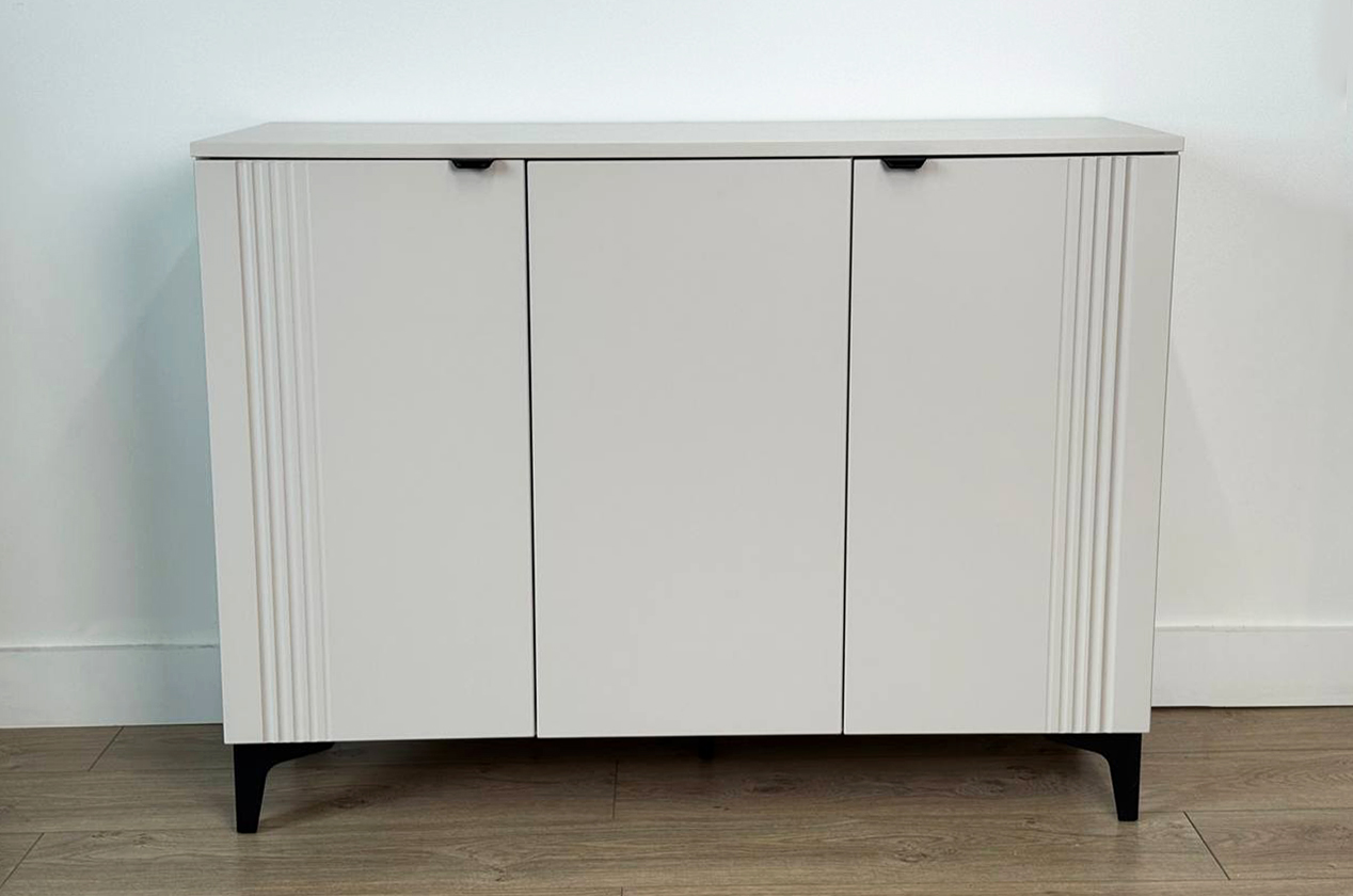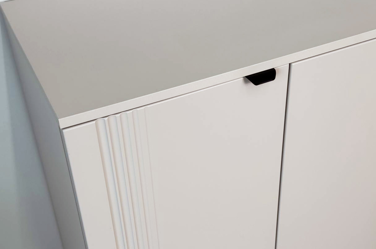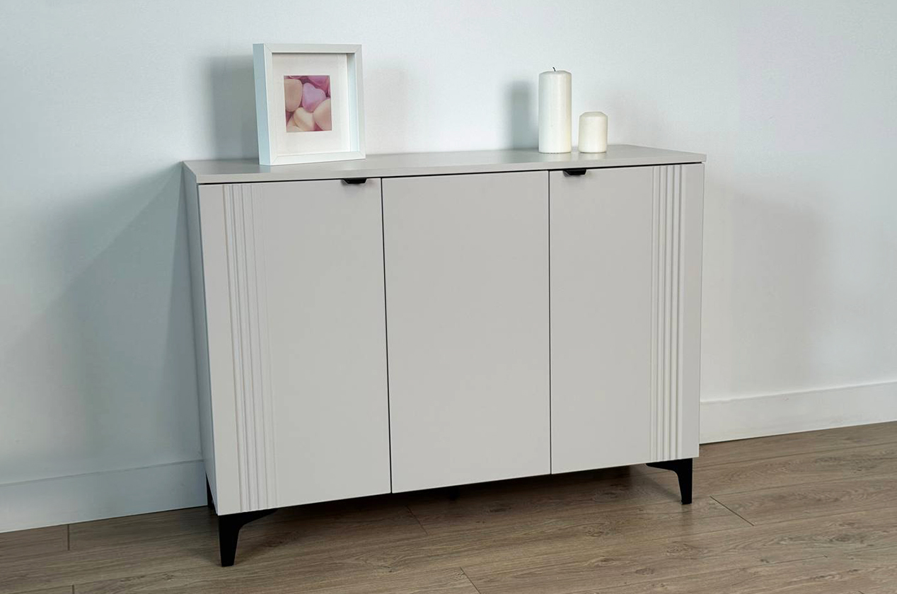 • • Элегантный дизайн: Фрезерованные фасады из МДФ придают комоду рельефность и изысканный вид, делая его полноценным элементом декора.