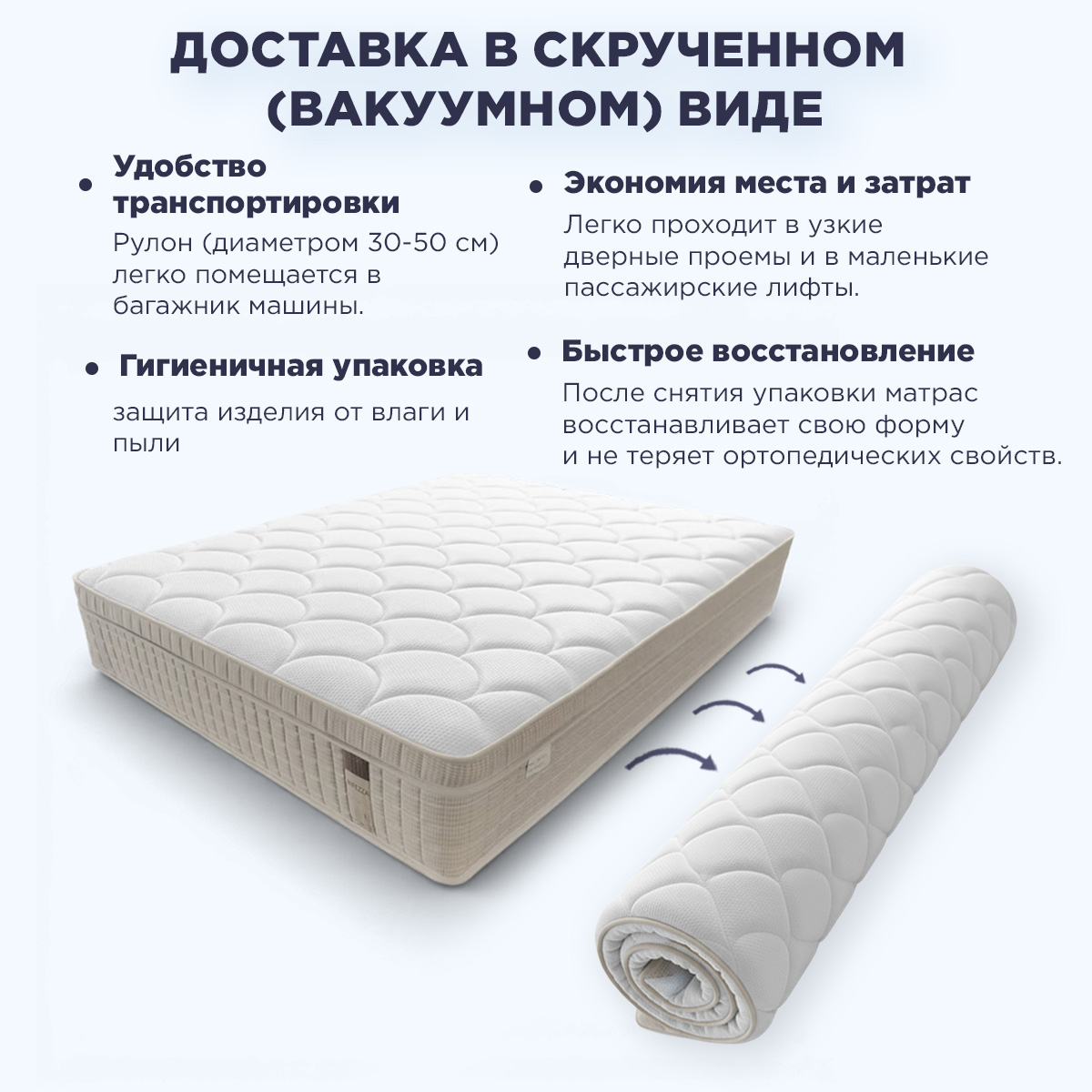 • ✓ Умная доставка в вакуумной упаковке (roll pack): Главное удобство современности! Матрас поставляется свернутым в компактный рулон, что: