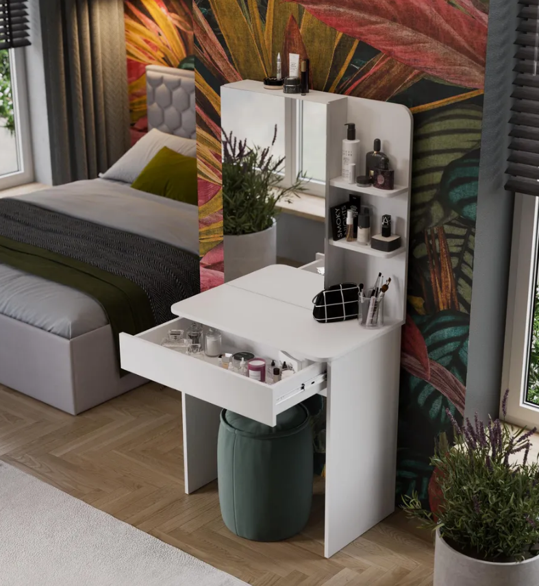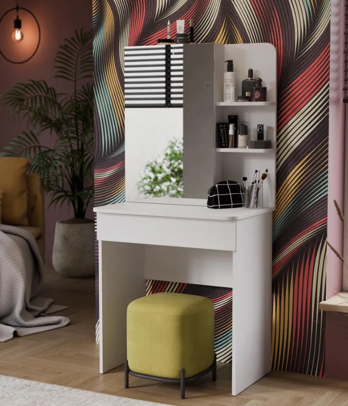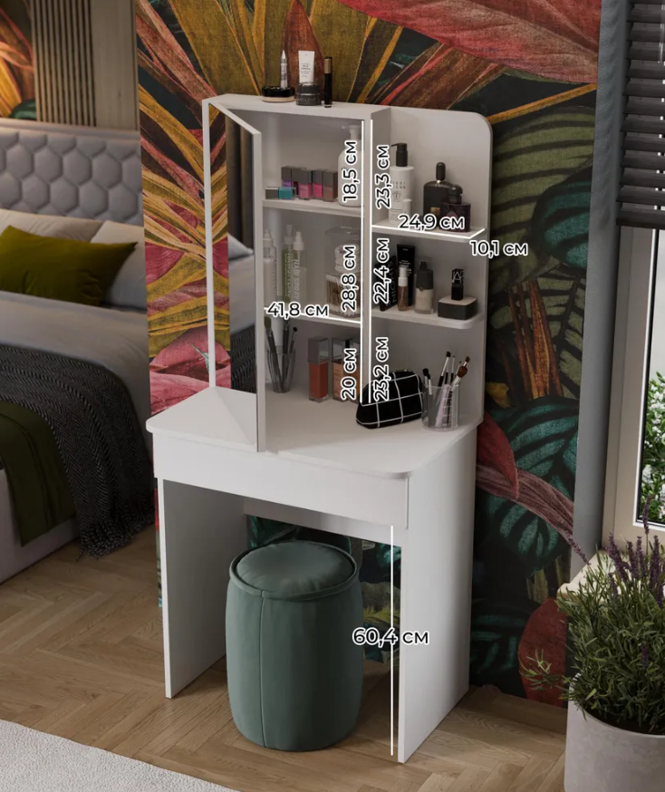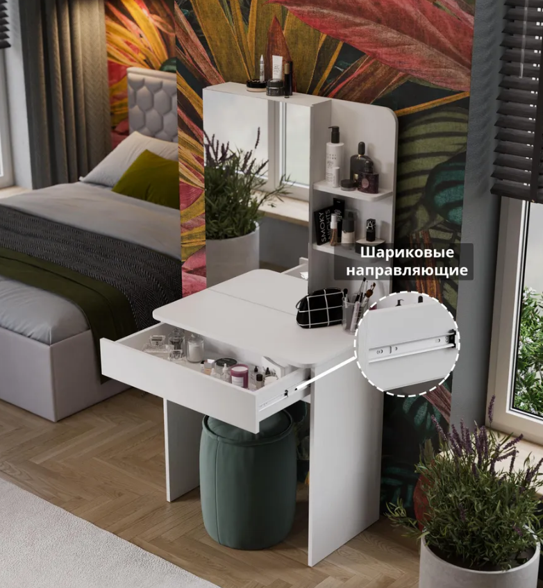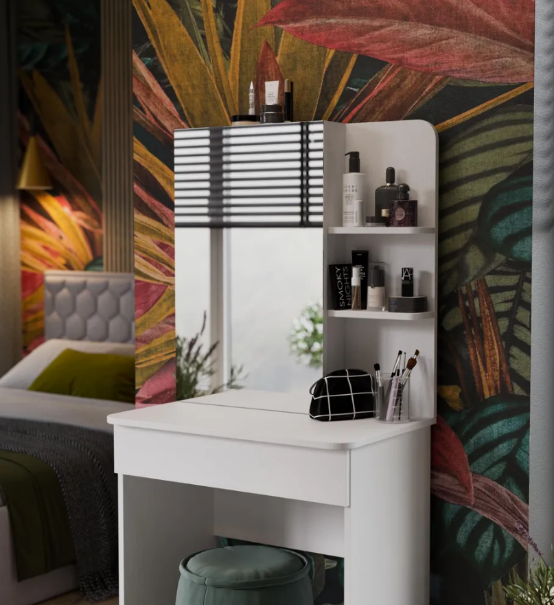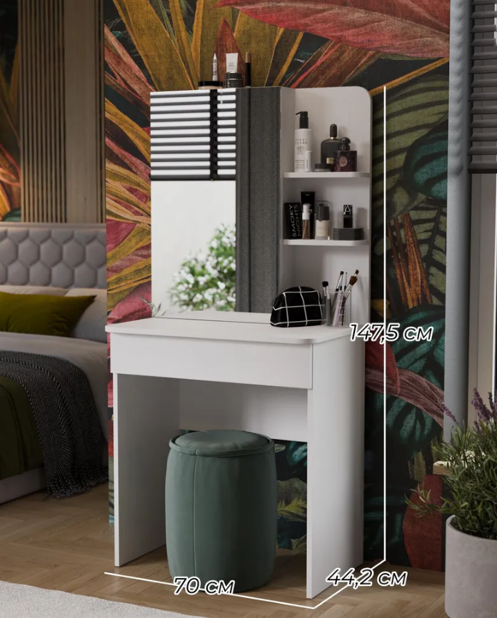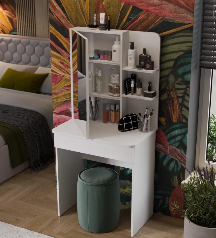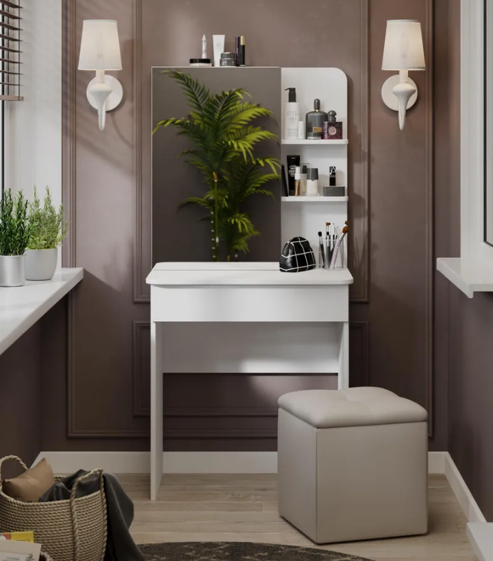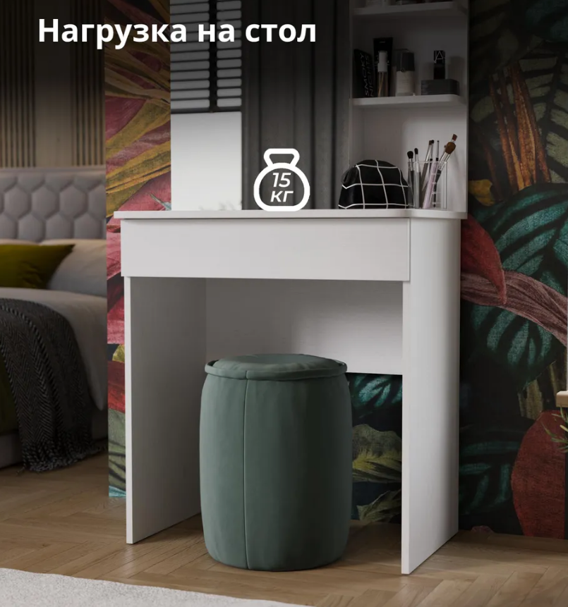 • Каркас новинки выполнен из прочной ламинированной древесно-стружечной плиты, обработанной кромкой ПВХ, которая устойчива к сколам и механическим повреждениями и сохраняет свой первоначальный цвет даже под воздействием солнца. При этом материалы экологически безопасны и соответствуют высоким стандартам качества. • В туалетном столике «Майя» есть приятное дополнение. За зеркалом имеются дополнительные скрытые полки для хранения, которые спасут столик от загромождённости и освободят место для предметов декора.