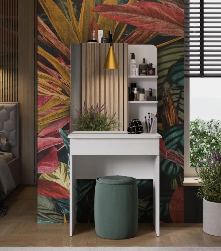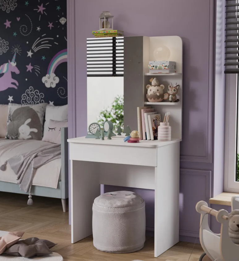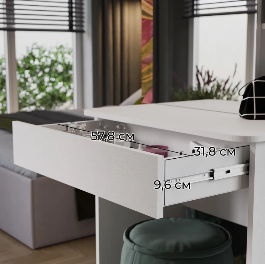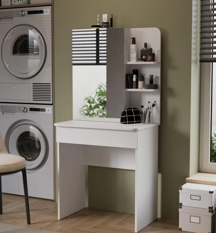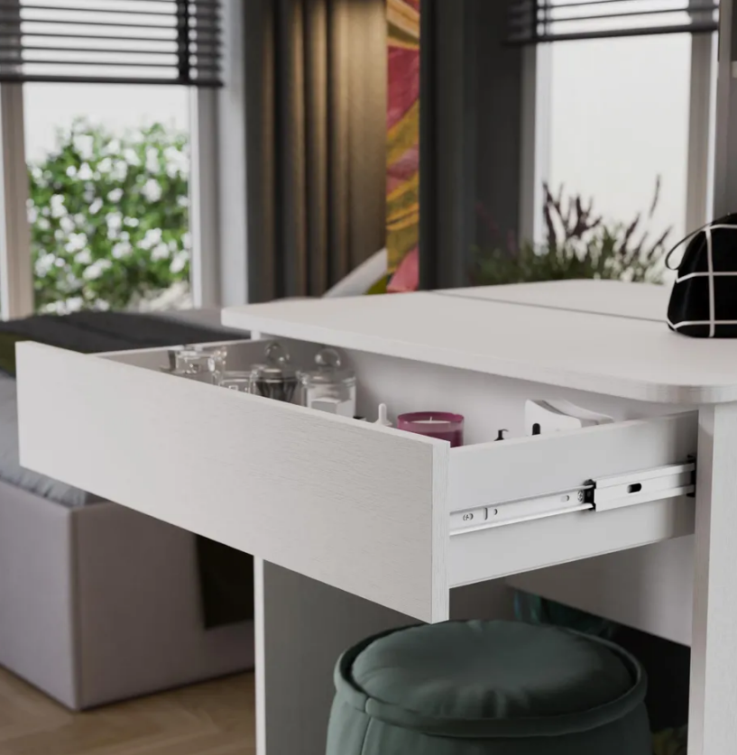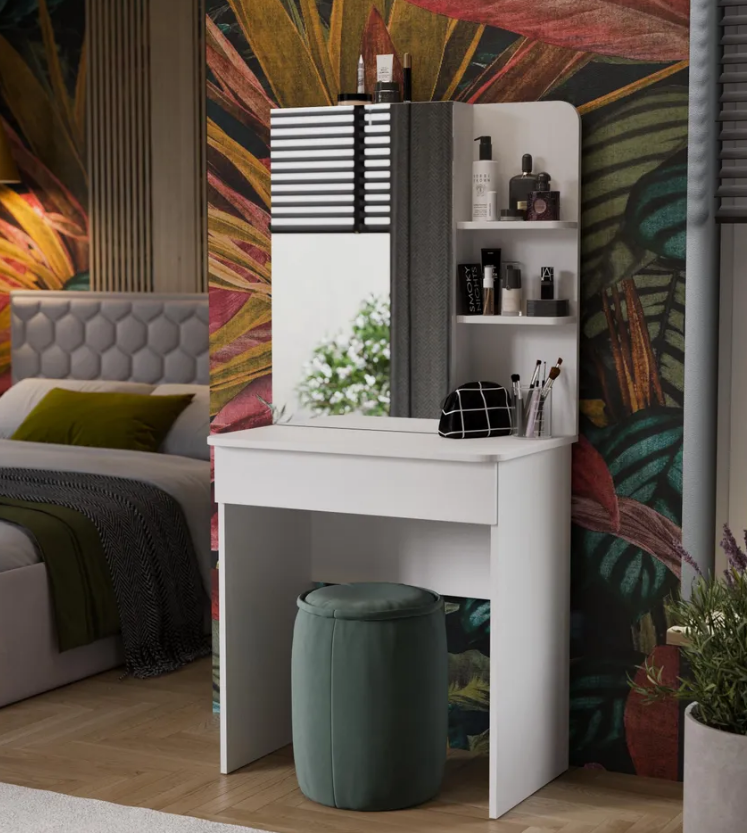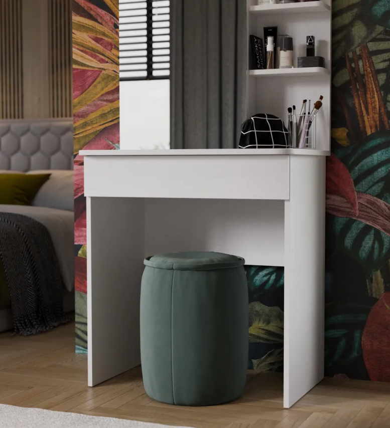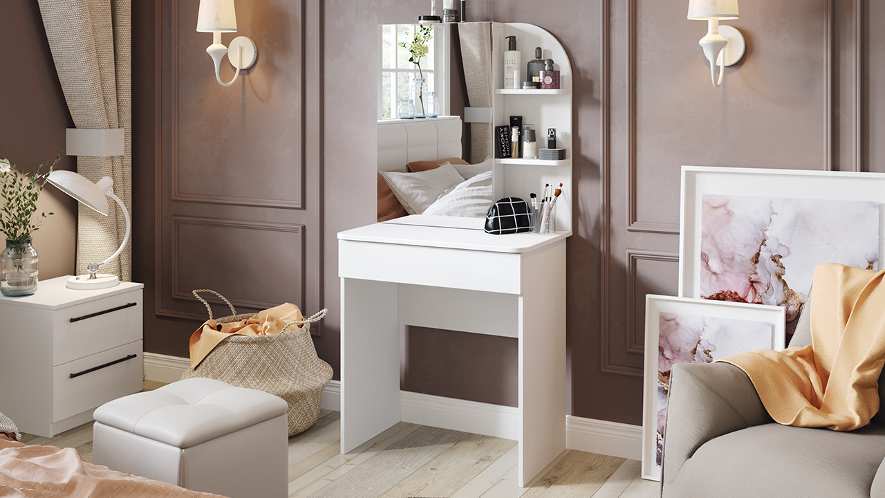 • Каркас новинки выполнен из прочной ламинированной древесно-стружечной плиты, обработанной кромкой ПВХ, которая устойчива к сколам и механическим повреждениями и сохраняет свой первоначальный цвет даже под воздействием солнца. При этом материалы экологически безопасны и соответствуют высоким стандартам качества. • В туалетном столике «Майя» есть приятное дополнение. За зеркалом имеются дополнительные скрытые полки для хранения, которые спасут столик от загромождённости и освободят место для предметов декора.