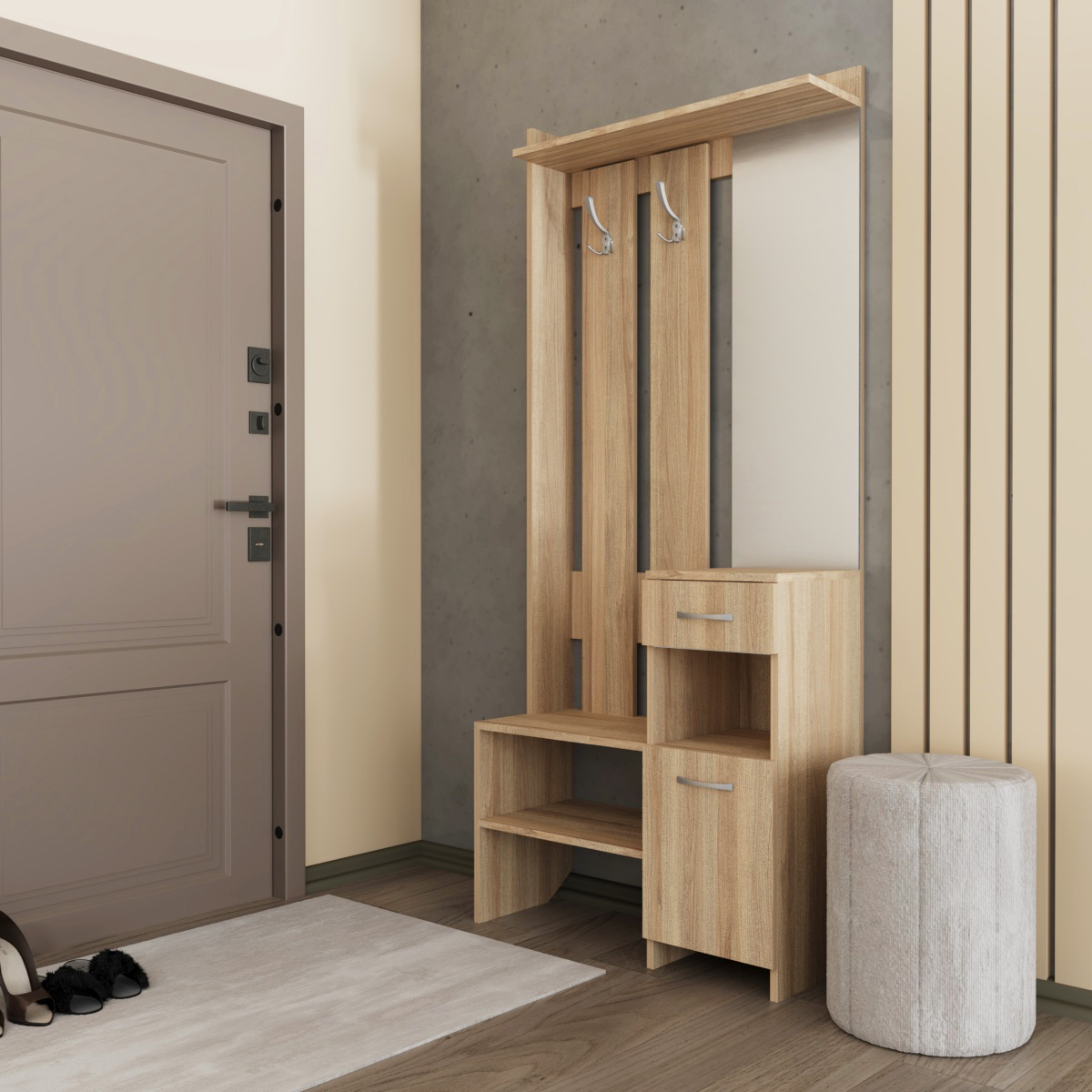 ✓ Выдвижной ящик: Практичный выдвижной ящик позволит удобно хранить мелкие предметы и аксессуары, поддерживая порядок в прихожей.